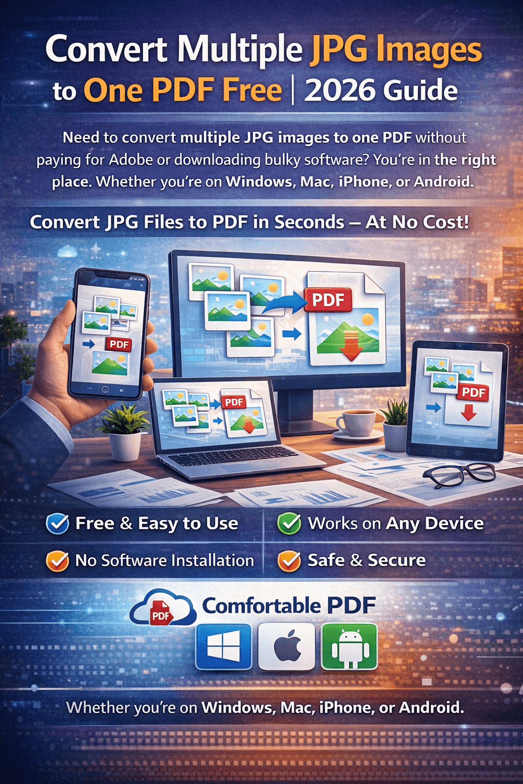 Need to convert multiple JPG images to one PDF without paying for Adobe or downloading bulky software? You're in the right place. Whether you're on Windows, Mac, iPhone, or Android — this step-by-step 2026 guide shows you the fastest, easiest ways to combine JPG files into a single PDF, completely free.